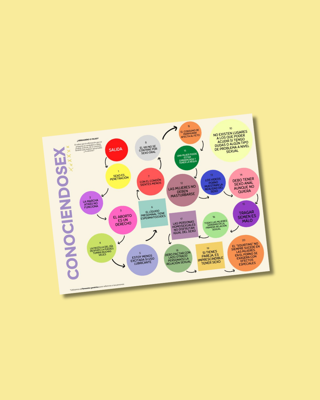 ConociendoSEX es un juego didáctico diseñado para trabajar la Educación Sexual Integral de forma lúdica participativa y crÃtica a través de una serie de afirmaciones que deben clasificarse como verdaderas o falsas abordando temas como anticoncepción consentimiento placer diversidad sexual derechos reproductivos y mitos sexuales.